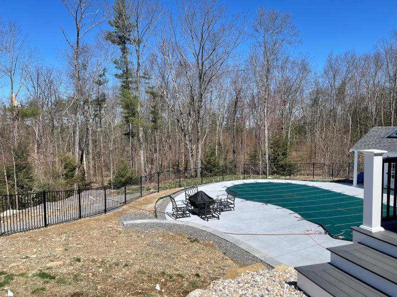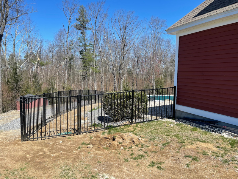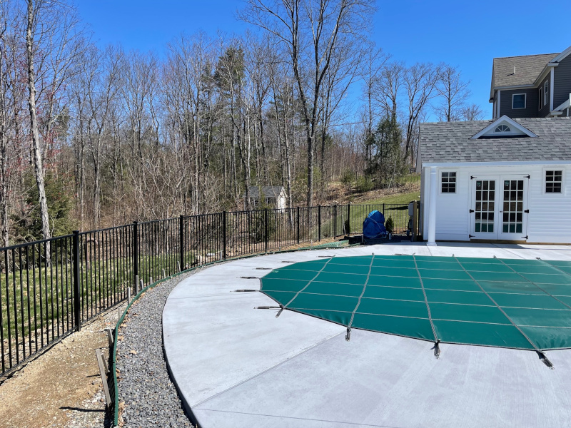 The crew from Granite State Fence installed Black Aluminum fencing to safely enclose the pool for this property in Chester, NH.