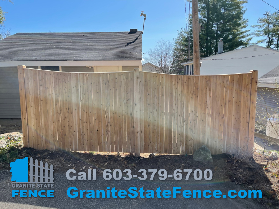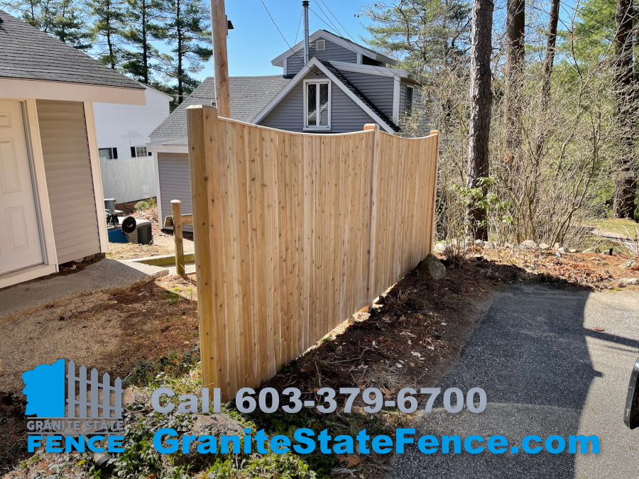Today we replaced a rotted cedar fence with new cedar scalloped board panels with cap strips and cedar chauffeured posts for this residential property in Goffstown, NH.