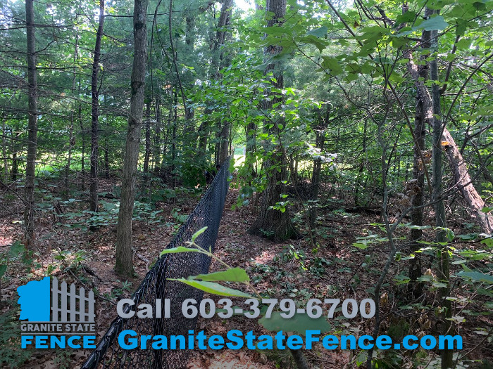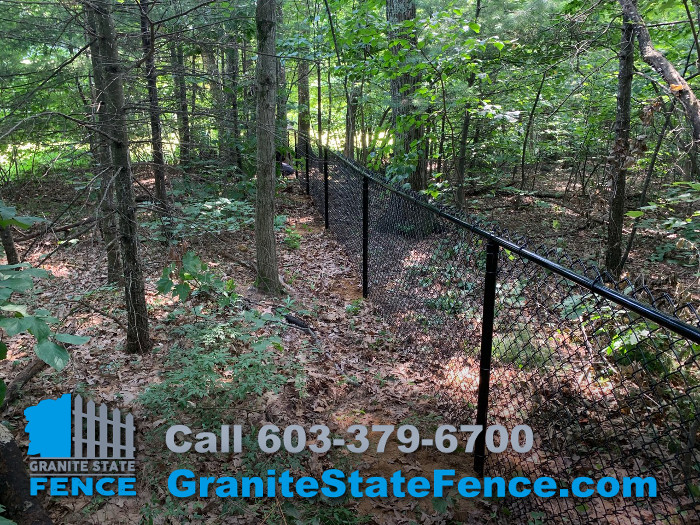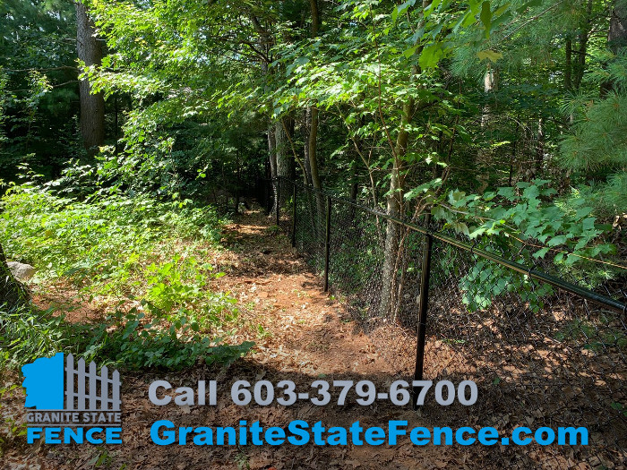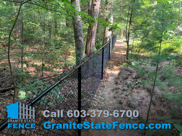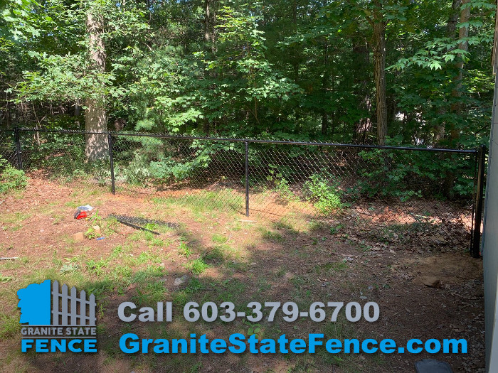 Our customer in Derry, NH wanted a large dog run for their new puppy so we cleared a path in the woods and installed black 4’ chain link fencing for them.