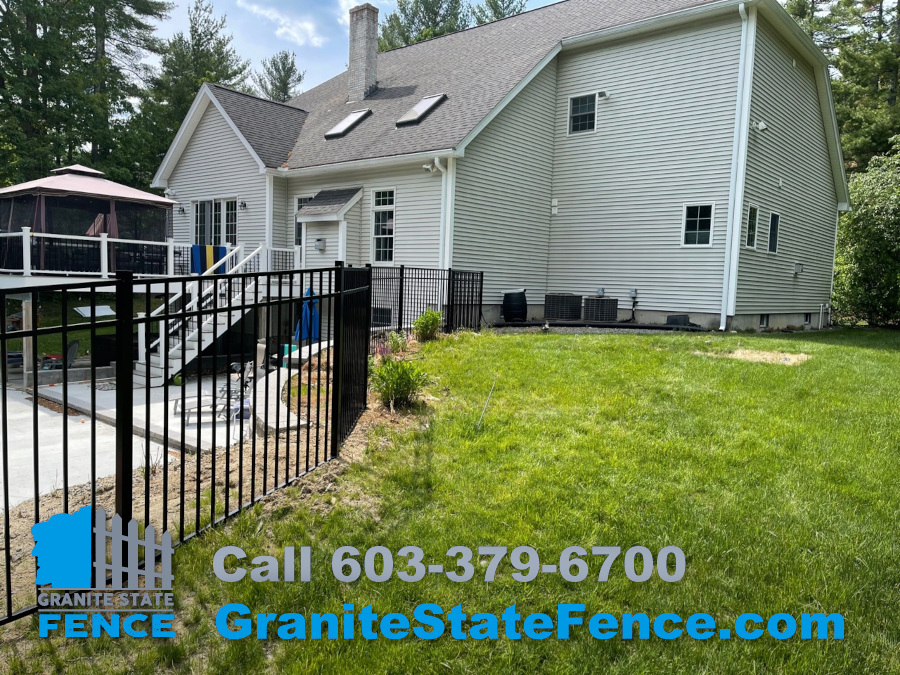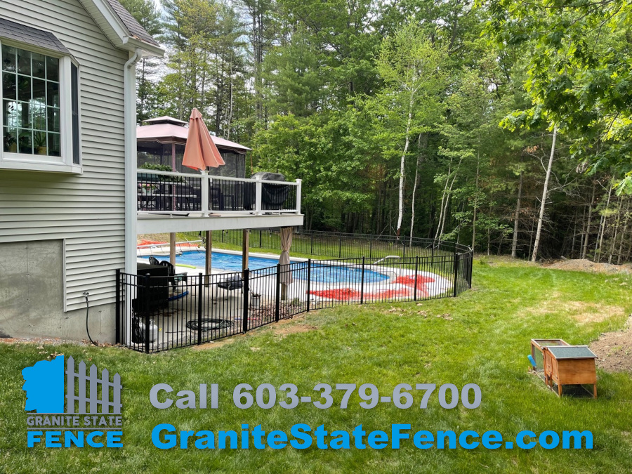 We installed black 54” pool code aluminum 3 rail fence to safely enclose this pool in Litchfield, NH.