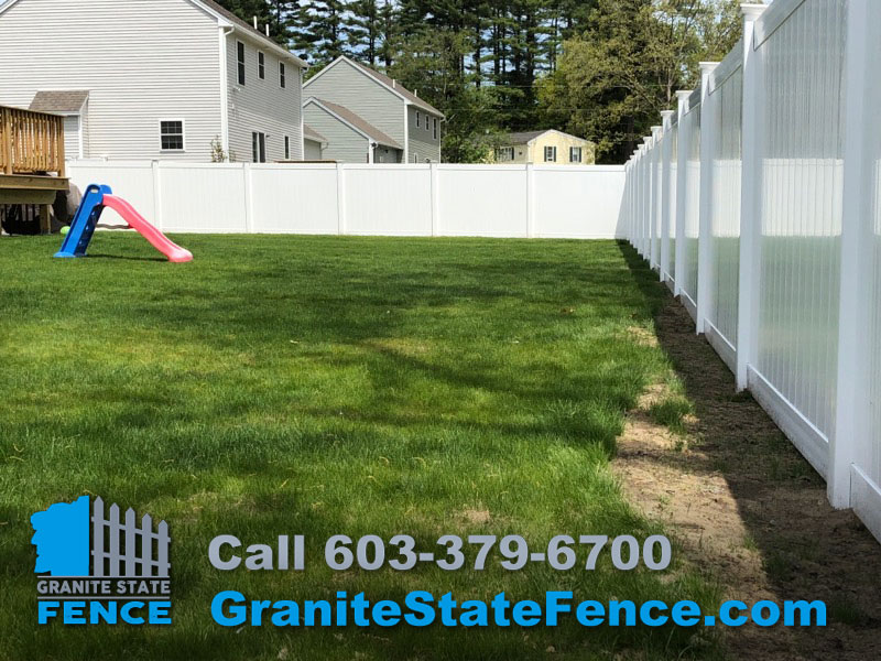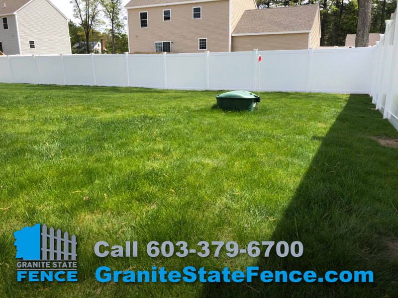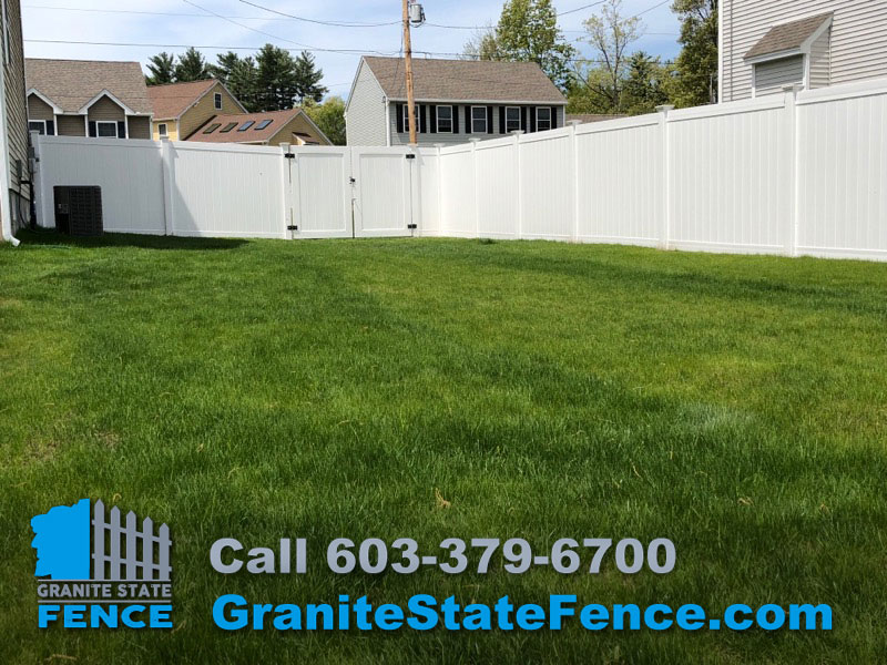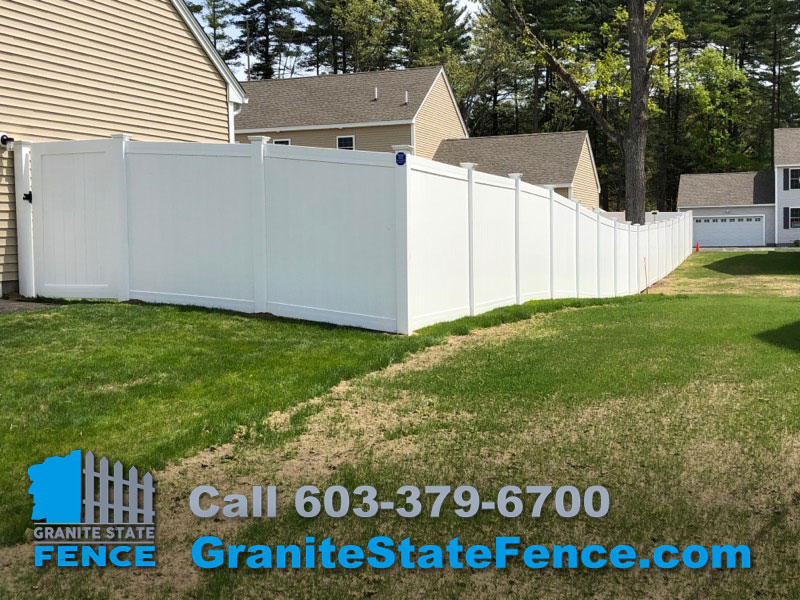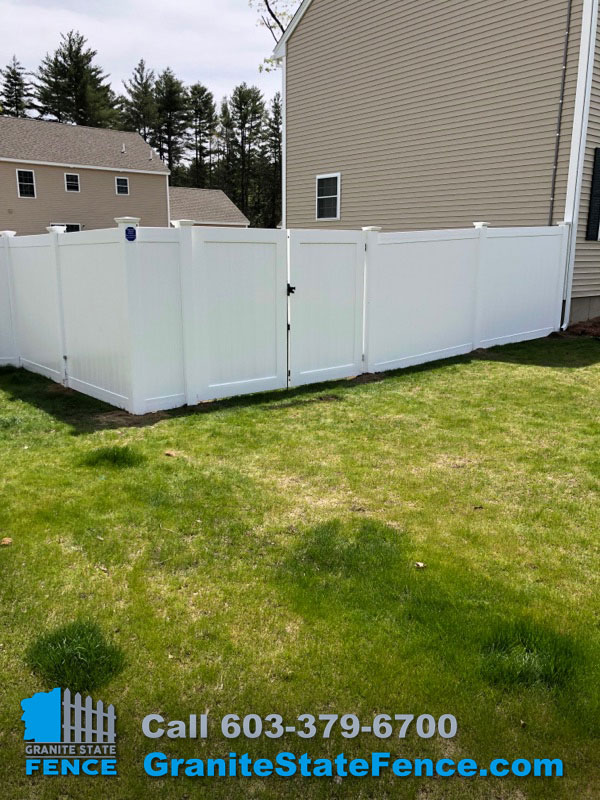 Granite State Fence is a full service residential and commercial fencing contractor. Our installers completed this Installation of 6’ white vinyl privacy fence with gates in Hudson NH. This install enclosed a large backyard and included double drive gates for equipment access.